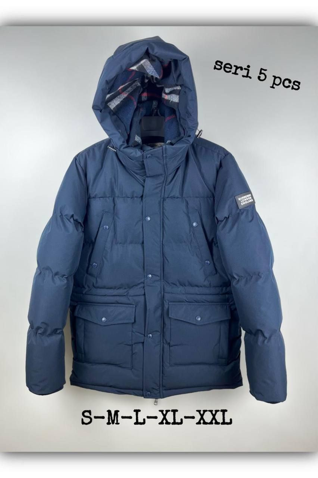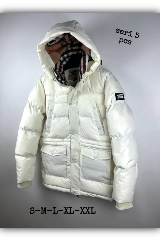 Kokvilnas, sarža pinuma, zosu dūnu, dūnu un spalvu pildījums, tonāls logotips, noņemama kapuce, augsta apkakle, 2 virzienu rāvējslēdzējs priekšā, garas piedurknes, Divas rāvējslēdzēja kabatas uz krūtīm un divas rāvējslēdzēja kabatas sānos.